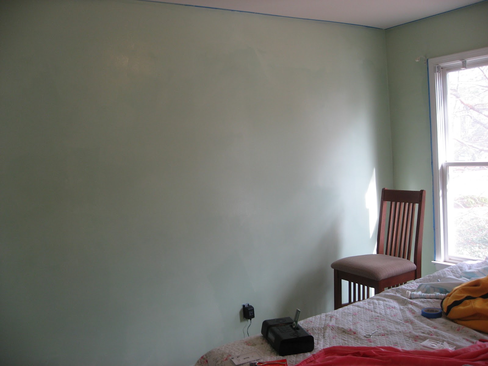 So I wanted to turn the room from baby blue to a calming shade of green.  When I did the test patch, I painted and walked away and checked it 24 hours later, so I didn't actually see it drying.  When I painted the whole room though, I did notice it drying and it freaked me out.  It dries incredibly uneven.  I was worried that I had made a huge error in judgement for not using a primer. But when the whole room dries, it is completely even and has full coverage after one coat.  one gallon covered the entire 12 X 10 ft room.